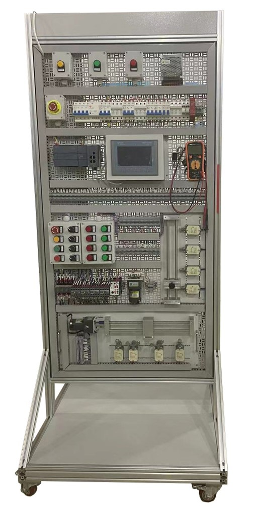 (1)金屬不銹鋼網(wǎng)孔板臺架,預(yù)先安裝以上全部控制線路和裝置,符合國家安全標(biāo)準(zhǔn),底座帶有可鎖定腳輪。 (2)不銹鋼網(wǎng)孔板厚度≥1.5mm,網(wǎng)孔板表面光滑、不易變形,采用標(biāo)準(zhǔn)機(jī)柜螺母安裝。 (3)設(shè)有空開安全防護(hù)、短路保護(hù)等,三相帶漏電保護(hù)器控制總電源,設(shè)有急停按鈕可安全可靠切斷電源。220V空氣開關(guān),380V空氣開關(guān)可單獨控制交流接觸器單元、開關(guān)電源、PLC、觸摸屏、變頻器、直流24V\5V電源。各斷路器動作電流時按實際負(fù)載選取?刂齐娐冯妷簽橹绷24V,配有安全繼電器控制,配有接線端子等方便實訓(xùn)。 |