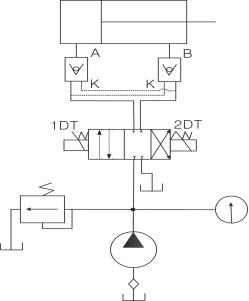 在圖示位置時(shí),液壓泵輸出油液通過換向閥回油箱,系統(tǒng)無(wú)壓力,液控單向閥A、B關(guān)閉,液壓缸兩腔均不能回油,于是,活塞被雙向鎖緊。要使活塞向右運(yùn)動(dòng),則需換向閥1DT通,左位接入系統(tǒng),壓力油經(jīng)單向閥A進(jìn)行液壓缸左腔,同時(shí)也進(jìn)入液控單向閥B的控制油口K,打開閥B,液壓缸右腔回油可經(jīng)閥B及換向閥回油箱,活塞便向右運(yùn)動(dòng)。反之向左,液控單向閥的密封性好,所以鎖緊效果較好。