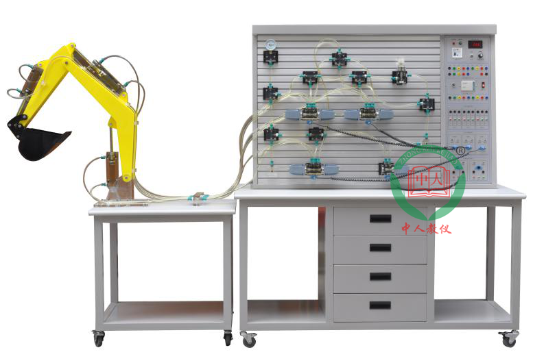 一、主要技術參數(shù) 1、電源:AC220V 50HZ 2、直流電源輸入AC220V 輸出DC24V/3A 3、可編程控制器(PLC):三菱FX1S-20MR主機 12輸入 8輸出(繼電器輸出方式) 4、液壓實驗泵電機功率:250W, 調速范圍0-1500r/min,液壓泵工作時噪聲≤58dB, 演示實驗油路液流要求壓力僅需0.3-1.3Mpa (油泵最高壓力:Pmax=2.5Mpa) 5、電磁換向閥:AC220V 吸力3Mpa 6、實訓臺外型尺寸:1500mm×650mm×1700mm 7、挖掘機實訓臺挖掘動作時總外型尺寸:1850mm×650mm×1850mm 二、特點: 1、在原有透明液壓PLC控制實訓裝置幾十種基本回路上增加了可模擬真實挖掘機工作裝置各種動作。 2、透明挖掘機液壓試驗臺可模擬真實挖掘機工作裝置的各種動作。液壓系統(tǒng)采用進口透明機玻璃液壓元件、透明尼龍軟管搭接而成,液壓元件結構、工作原理,液壓回路工作原理一目了然。整個實驗臺具有形象、直觀、方便、可靠等優(yōu)點。 3、透明液壓試驗臺主要由實驗桌、實驗支架、液壓元件和電器控制器件、可編程控制器(PLC)等組件組成。 4、配備全常用液壓元件:每個液壓元件均配有安裝底板,可方便、隨意地將液壓元件安放在鋁合金型材面板上(面板帶“T”溝槽形式的鋁合金型材結構)。油路搭接采用快換接頭,拆接方便,不漏油。 5、電氣主控單元采用PLC可編程序控制器控制,可與PC微機通訊實現(xiàn)微機智能控制,同時以液壓回路為控制對象,加強對PLC控制可編程序控制器的學習及應用。 6、實驗控制單元也可以采用獨立的繼電器控制單元進行電氣控制,通過比較,突出PLC可編程序控制的優(yōu)越性和先進性,加深對PLC編程器的了解與掌握。 三、主要功能: 1、 真實演示挖掘機工作裝置的挖掘、卸料、提升等動作; 2、 了解挖掘機液壓系統(tǒng)組成及工作原理,各元件內部結構及工作過程; 3、 進行挖掘機液壓系統(tǒng)拆裝和組合、電氣控制系統(tǒng)回路實驗; 4、 進行挖掘機液壓系統(tǒng)壓力、流量等參數(shù)的測量實驗。 四、液壓基本實驗的換向回路 1、用手動換向閥的換向回路。 2、用中位機能換向閥的用鎖回路。 3、用液控平向閥的閉鎖回路。 4、壓力調定回路。 5、二級壓力控制回路。 6、用減壓閥的減壓回路。 7、用增壓缸的增壓回路。 8、用H型換向閥的卸載回路。 9、進油節(jié)流調速回路。 10、回油節(jié)流調速回路。 11、調速齒輪泵的換向調速回路。 12、調速齒輪泵和調速閥組成的復合調速回路。 13、流量閥短接的速度換接回路。 14、用調速閥串連聯(lián)的二次進給同路。 15、用調速閥并聯(lián)的二次進給同路。 16、用順序閥的順序動作回路。 17、用壓力繼電回的順序動作回路。 18、用行程開關控制的順序動作回路。 19、用行程換向閥的順序動作回路。 20、串聯(lián)液壓缸的同步回路。 21、用先導型溢流閥控制的換向回路 22、液壓挖掘機液壓回路