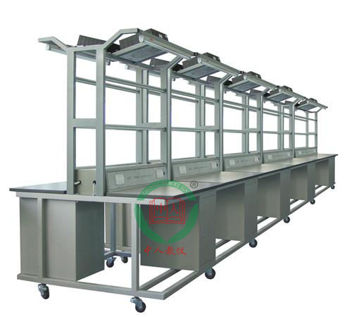 電子裝配實訓(xùn)臺:實訓(xùn)臺上提供日光燈(用于照明) 2 個,透明的 PVC 板 4 個,可夾放原理圖等資料,另外還配備三芯雙聯(lián)暗插座 4 個、兩芯暗插座 2 個、工具柜 2 個,工作臺面設(shè)有綠色防靜電桌墊,整個裝配線安全可靠。