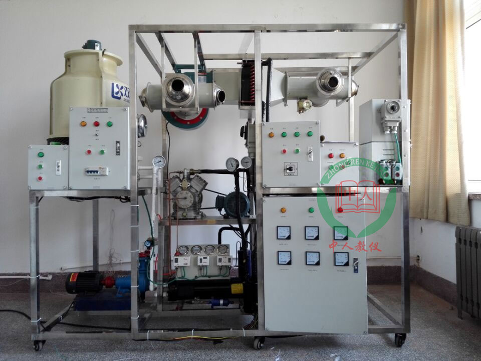 實訓(xùn)裝置主要由控制臺、水冷制冷機(jī)組、高溫風(fēng)機(jī),風(fēng)機(jī)管道,管道調(diào)節(jié)閥門、主機(jī)實訓(xùn)模塊、連軸式冷卻水泵,冷卻塔,溫度和壓力傳感器等組成溫度和壓力表等組成