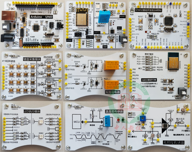 8)單獨(dú)實(shí)驗(yàn)用的基礎(chǔ)模塊(采用磁吸結(jié)構(gòu),彈性插針通信):溫濕度教學(xué)模塊、光敏傳感器教學(xué)模塊、氣體傳感器教學(xué)模塊、門磁傳感器教學(xué)模塊、人體紅外傳感器教學(xué)模塊、紅外對(duì)射傳感器教學(xué)模塊、土壤濕度傳感器教學(xué)模塊、繼電器執(zhí)行器教學(xué)模塊、云臺(tái)控制器教學(xué)模塊、zigbee單片機(jī)教學(xué)模塊,WIFI嵌入式集成網(wǎng)關(guān)教學(xué)模塊、STM32F103RCT6單片機(jī)教學(xué)模塊、STM32F103C8T6單片機(jī)教學(xué)模塊、按鍵教學(xué)模塊、LED教學(xué)模塊、4-20mA工業(yè)傳感器教學(xué)模塊、紅外遙控收發(fā)教學(xué)模塊、zigbee無線傳感網(wǎng)絡(luò)節(jié)點(diǎn)教學(xué)模塊等。