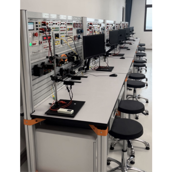 尺寸1600*800*1650mm;單面型鋁型材屏;鋁型材框架;剎車腳輪;臺架設(shè)有一抽一鍵,實(shí)驗(yàn)桌主體結(jié)構(gòu)全部采用高性能表面氧化的鋁型材及一次成型鋁壓鑄框架連接構(gòu)件,連接構(gòu)件采用壓鑄成型工藝(非焊接工藝),經(jīng)機(jī)加工、拋丸、噴砂,表面靜電噴涂工藝,安裝方便、快捷,用戶可自行DIY組裝。桌體立柱采用工業(yè)鋁型材成型工藝,表面氧化處理,截面尺寸:70×70mm,四面帶槽,槽寬約8mm,端部配套塑料堵頭。桌面采用25mmE1級三聚氰胺飾面板,桌面板下設(shè)支撐框架,承受力不少于300kg。配備儲存柜,存放實(shí)訓(xùn)掛箱等,儲存柜底部4只高強(qiáng)度萬向可制動PU腳輪,方便移動。實(shí)訓(xùn)裝置整體簡約不簡單,高端大氣,符合現(xiàn)代化產(chǎn)品審美和發(fā)展趨勢。