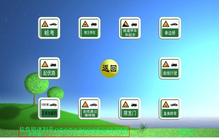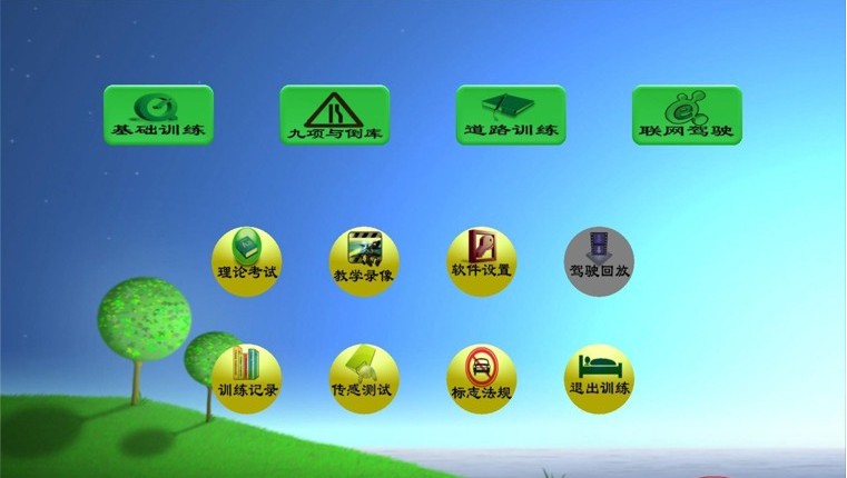 軟件主界面下圖所示,界面上有"基礎(chǔ)訓(xùn)練"、"九項(xiàng)與倒庫"、"道路訓(xùn)練"、"聯(lián)網(wǎng)駕駛"、"理論考試"、"教學(xué)錄像"、"軟件設(shè)置"、"駕駛回放"、"訓(xùn)練記錄"、"傳感測試"、"標(biāo)志法規(guī)"、"退出訓(xùn)練"。