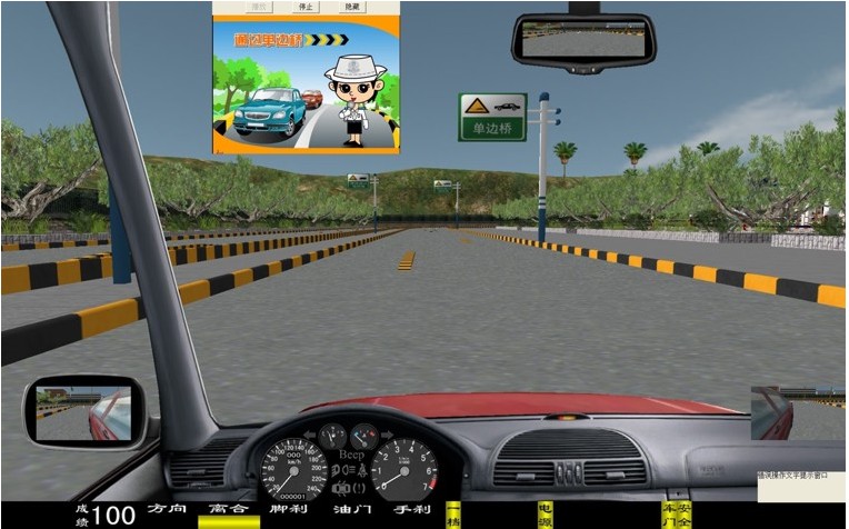 評(píng)判及提示語有:"通過單邊橋"考試開始,"通過單邊橋"考試結(jié)束,有一車輪未上橋,行駛中出現(xiàn)一個(gè)車輪掉下橋面,未通過單邊橋。