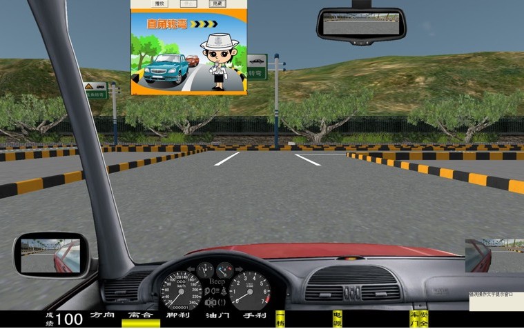 評(píng)判及提示語有: "直角轉(zhuǎn)彎"考試開始,"直角轉(zhuǎn)彎"考試結(jié)束,車輪觸軋突出點(diǎn)或者駛出邊緣線,中途調(diào)整車身位置,車輪觸軋道路邊緣線,借助倒車完成。