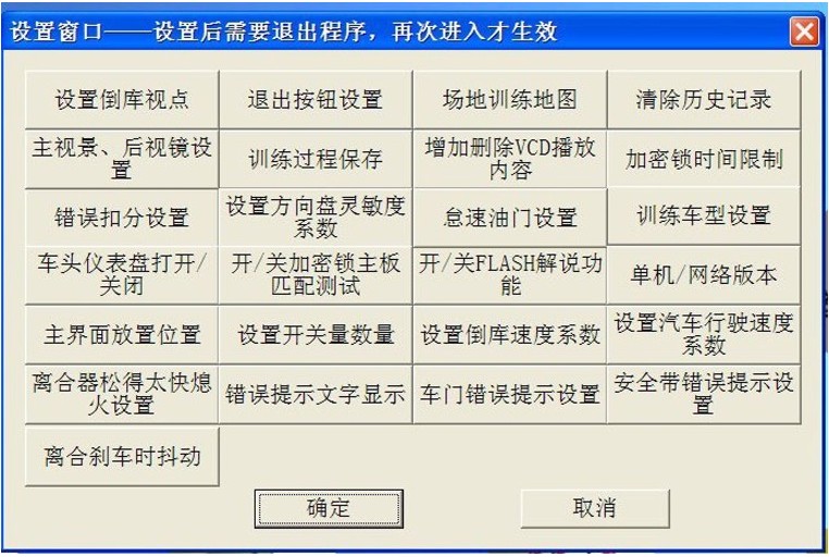 在設(shè)置界面,可以進(jìn)行設(shè)置的內(nèi)容有:"設(shè)置倒庫視點(diǎn)","退出按鈕設(shè)置","場地訓(xùn)練地圖","清除歷史記錄","主視景、后視鏡設(shè)置","訓(xùn)練過程保存","增加刪除VCD播放內(nèi)容","加密鎖時(shí)間限制","錯(cuò)誤扣分設(shè)置","方向盤靈敏度系數(shù)","怠速油門設(shè)置","訓(xùn)練車型設(shè)置","車頭儀表盤打開/關(guān)閉","開/關(guān)加密鎖主板匹配測試","開/關(guān)FLASH解說功能","單機(jī)/網(wǎng)絡(luò)版本","主界面放置位置","設(shè)置開關(guān)量數(shù)量","設(shè)置倒庫速度系數(shù)","設(shè)置汽車行駛速度系數(shù)","離合器松得太快熄火設(shè)置","錯(cuò)誤提示文字顯示","車門錯(cuò)誤提示設(shè)置","安全帶錯(cuò)誤提示設(shè)置","離合剎車時(shí)抖動(dòng)"。