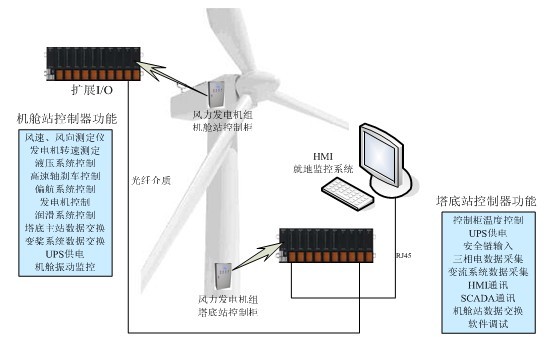 主控系統(tǒng)用于連接風(fēng)速風(fēng)向傳感器、震動傳感器、位置傳感器、測量、安全鏈、監(jiān)控系統(tǒng)等,控制風(fēng)速方向、偏航、變槳等信息。