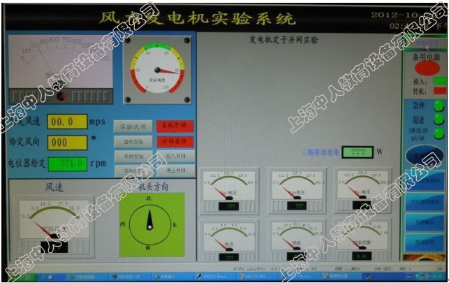 風(fēng)力發(fā)電機(jī)實(shí)驗(yàn)系統(tǒng)主要用于學(xué)生的教學(xué)實(shí)踐和科研開發(fā),通過風(fēng)機(jī)控制系統(tǒng)與風(fēng)機(jī)模擬系統(tǒng)的連接,盡可能的模擬實(shí)際風(fēng)力發(fā)電機(jī)運(yùn)行的工藝特點(diǎn)和控制要求。此系統(tǒng)開放性強(qiáng),可通過對控制系統(tǒng)和模擬系統(tǒng)的PLC 編程,實(shí)現(xiàn)對不同類型風(fēng)機(jī)的模擬以及控制仿真,可用于學(xué)生理論研究、實(shí)踐等。實(shí)現(xiàn)變速恒頻風(fēng)力機(jī)組發(fā)電狀態(tài)的模擬,包括轉(zhuǎn)速、轉(zhuǎn)矩、發(fā)電量及有功、無功調(diào)節(jié)。