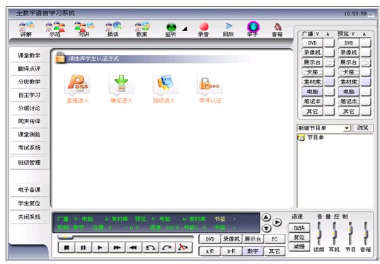 (9) 節(jié)目播放:教師指定素材庫中任意多路聲音節(jié)目播放,學(xué)生可隨意切換收聽;
