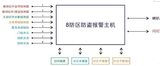 用戶與報(bào)警系統(tǒng)間的通訊界面。用戶可通過鍵盤發(fā)布指令;鍵盤則在用戶的整個(gè)操作過程中提供可視顯示和有聲提示。帶標(biāo)有數(shù)字的防區(qū)指示燈,用于顯示各個(gè)防區(qū)的狀態(tài)