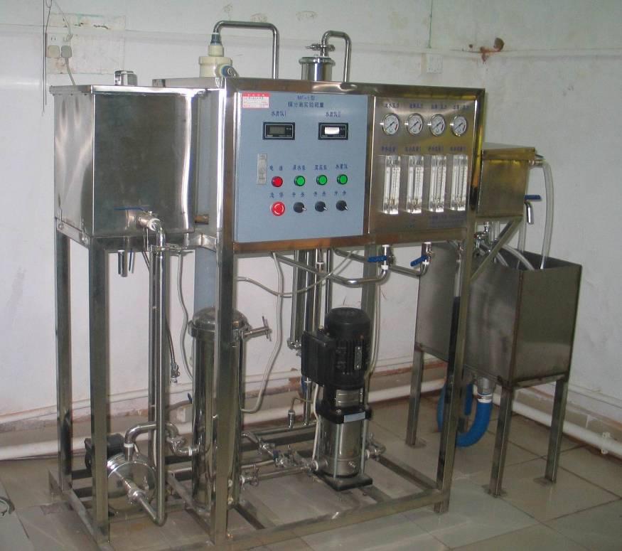(1) 設(shè)備主體:半箱式結(jié)構(gòu),設(shè)備主體及全部管路為1Cr18Ni9Ti不銹鋼制造。 (2) 控制箱集成于對象之上,面板為不銹鋼材料。 (3) 不銹鋼高壓進(jìn)料泵:流量-180L/H,壓力0.1~0.8Mpa。 (4) 壓力:指針壓力表,測量范圍:0.1~0.6MPa。 (5) 進(jìn)水流量:轉(zhuǎn)子流量計(jì),測量范圍:250L/H。 (6) 出水流量:轉(zhuǎn)子流量計(jì),測量范圍:0~50L/H。 (7) 濃 度:數(shù)顯電導(dǎo)率儀 (8) 膜組件:粗濾器、保安濾、超濾、微濾透各一套。 (9) 保安濾:線繞式芯+不銹鋼外殼,出水量25-250L/H, (10) 微濾膜:塊狀炭 + 有玻璃透明外殼,出水量25-250L/H,截流分子量500000以上。(孔徑0.2μm)。 (11) 超濾膜:中空纖維+不銹鋼外殼,出水量25-250L/H,截流分子量 50000-100000 (孔徑6.6-11nm)。 (12) 不銹鋼穩(wěn)流原水箱:不小于30L。 (13) 不銹鋼凈水箱:不小于7L。 (14) 不銹鋼濃水箱:不小于7L。 (15) 不銹鋼尾水回收箱,不小于30L。 | ||||