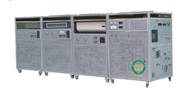 戶式中央空調(diào)實(shí)現(xiàn)考核系統(tǒng)是以變頻多聯(lián)機(jī)中央空調(diào)為母機(jī),采用模塊設(shè)計(jì),在四個(gè)約1100*1000*1930(以實(shí)物為準(zhǔn))鋁合金框架結(jié)構(gòu)的臺(tái)架內(nèi),分別裝有室外機(jī)組和三個(gè)不同的室內(nèi)機(jī)室(有嵌入式、風(fēng)管式和掛壁式)。在臺(tái)架的立面,有線路原理圖,在原理圖面板上安裝安全插,能測(cè)量關(guān)鍵點(diǎn)參數(shù)。在四塊電器原理圖版上,設(shè)置了約18個(gè)(以實(shí)際為準(zhǔn))常見故障點(diǎn),通過電腦控制,隨機(jī)是指模擬故障,讓學(xué)生在排故中學(xué)習(xí)、提高。教師可以通過電腦系統(tǒng)對(duì)學(xué)生成績進(jìn)行考核。